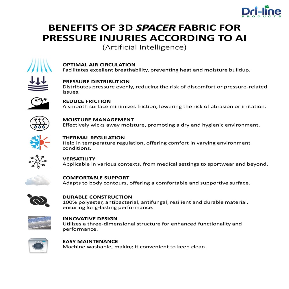 If a patient is at risk of developing pressure sores, he/she should be lying or seated on one of our PRP Double-Layer 3D Spacer Fabric products.